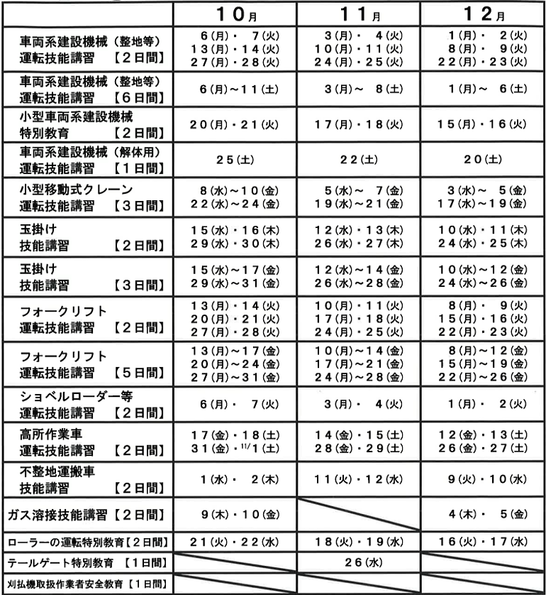 ★ 各種技能講習につきましては、お持ちの資格、経験、免許等により受講日数が変わりますのでお電話にてお問い合わせ下さい。
